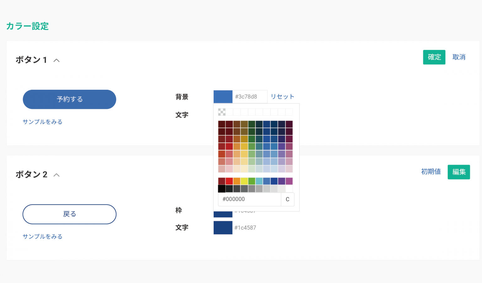カラーはカラーパレットから選択できるほか、任意のカラーコードを直接入力することもできるため、公式サイトと近いカラーを設定することで、統一感のある予約サイトとなり、ブランディング強化にもつながります。