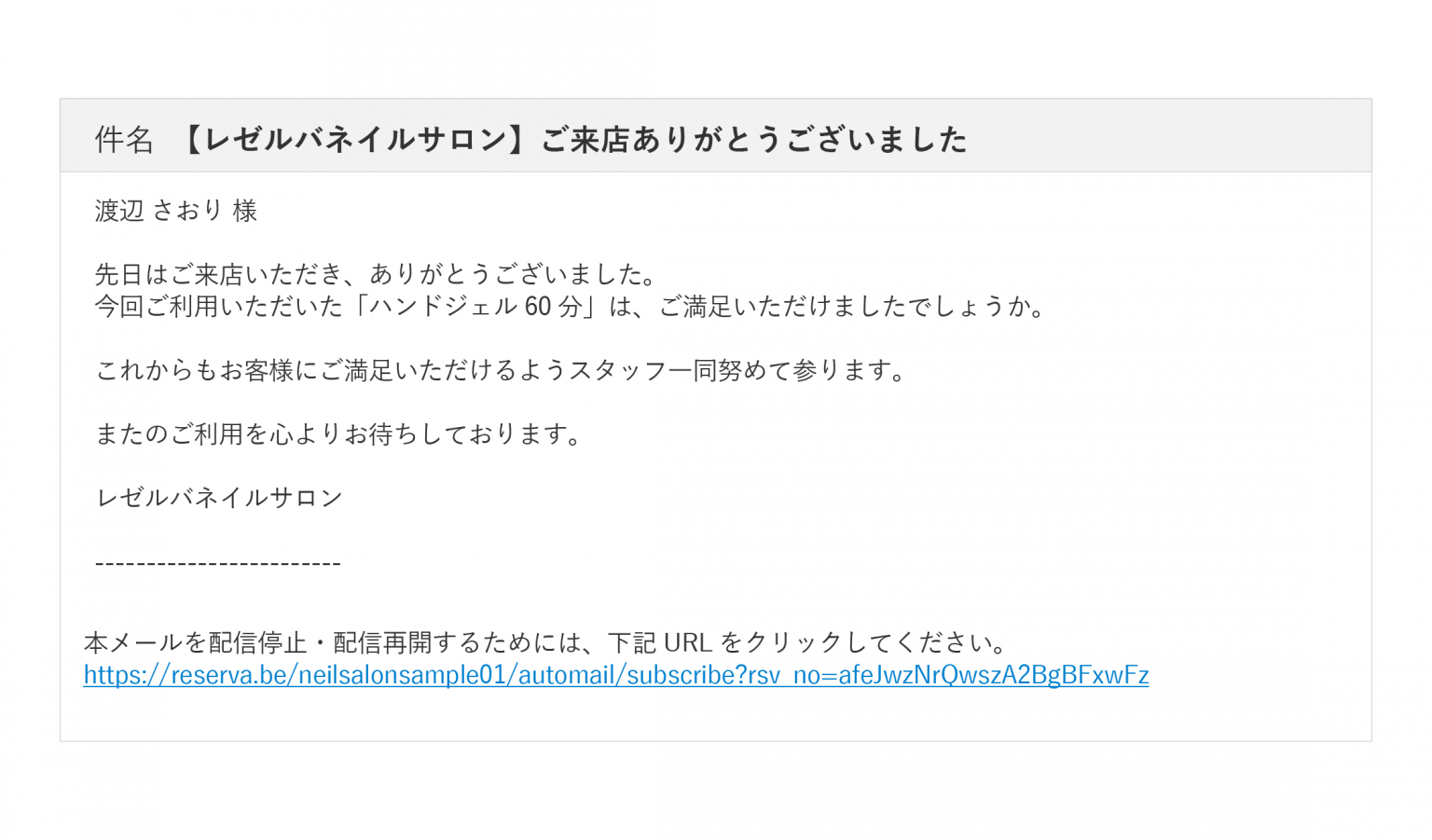 サンキューメールとは、予約サービス提供後にお客様宛に送られるメールのことです。「ご利用ありがとうございました。」といった、来店後のお礼メールが自動的に配信されるため、送信忘れを防ぐとともに、お客様のロイヤリティ向上に役立ちます。RESERVAでは、サンキューメール作成用のテンプレートがあらかじめ設定されていますが、テンプレートの内容にアレンジを加えることも可能です。