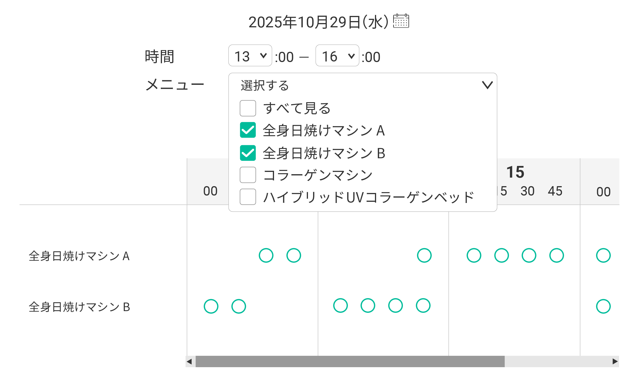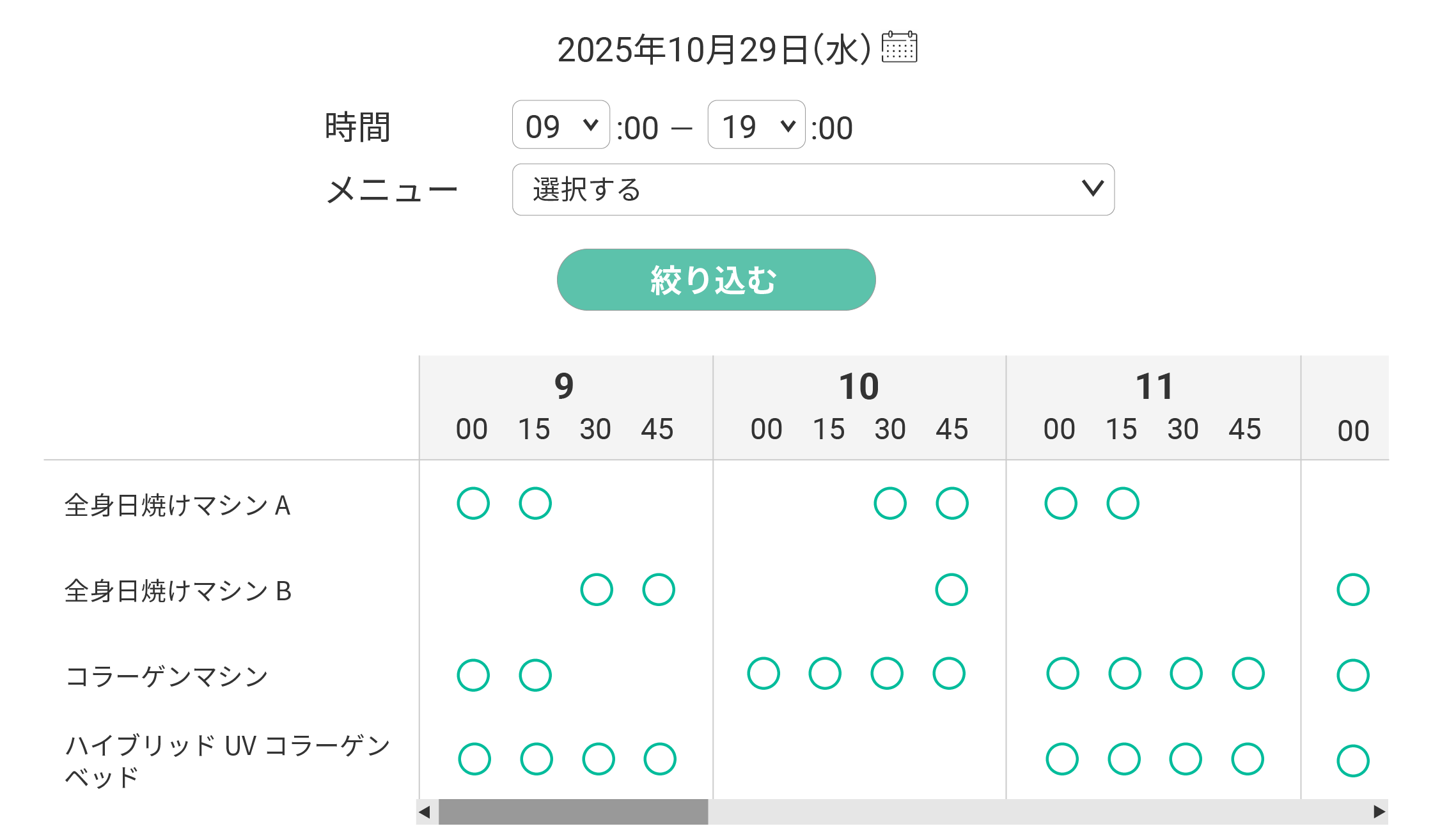 バナーをクリックすると、1日分の空き状況が表示されます。表示間隔は、管理画面側で15分、30分、60分の中から設定できます。表示する空き状況については、日付、時間、カテゴリ、メニューで絞り込むこともできるため、確認したい項目のみ表示させることが可能です。表示された空き状況の「〇」をクリックすると、対象メニューの日程選択画面に遷移します。そのまま予約を進めることができます。