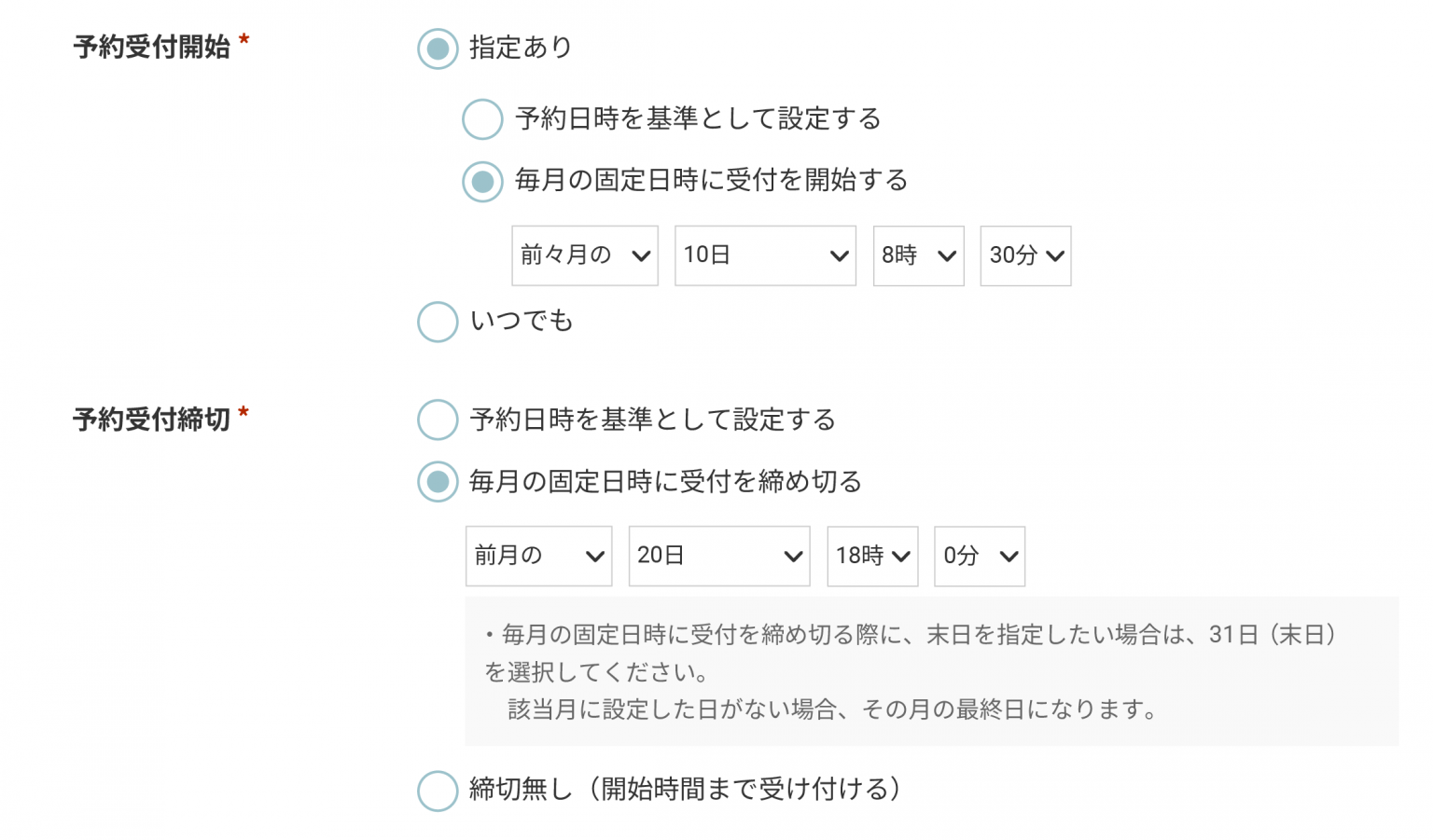 施設タイプは毎月の固定日時に受付を開始することも可能