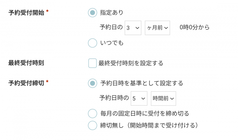 サービスに合わせて、予約受付の開始と締め切りの日時を細かく設定することができます。