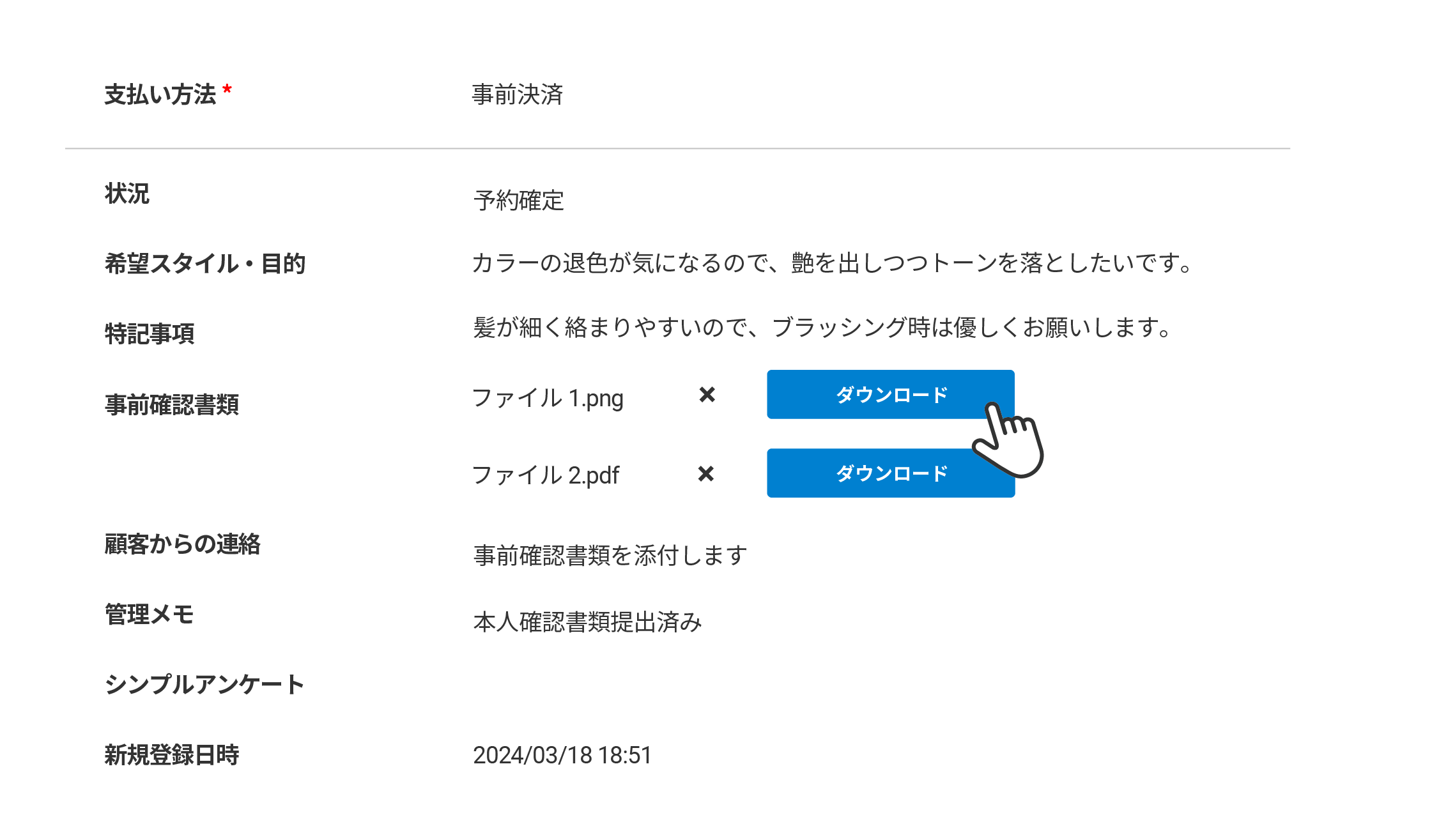予約時や会員登録時に、画像や書類などのファイルをアップロードできます。顧客側と管理者側ともにアップロードが可能なため、カウンセリングシートや施術同意書などの提出を求める場合などに役立ちます。事前に必要書類を提出すれば、予約当日までに内容の不備や記入漏れに気づくことができ、当日記入する時間も省くことができます。