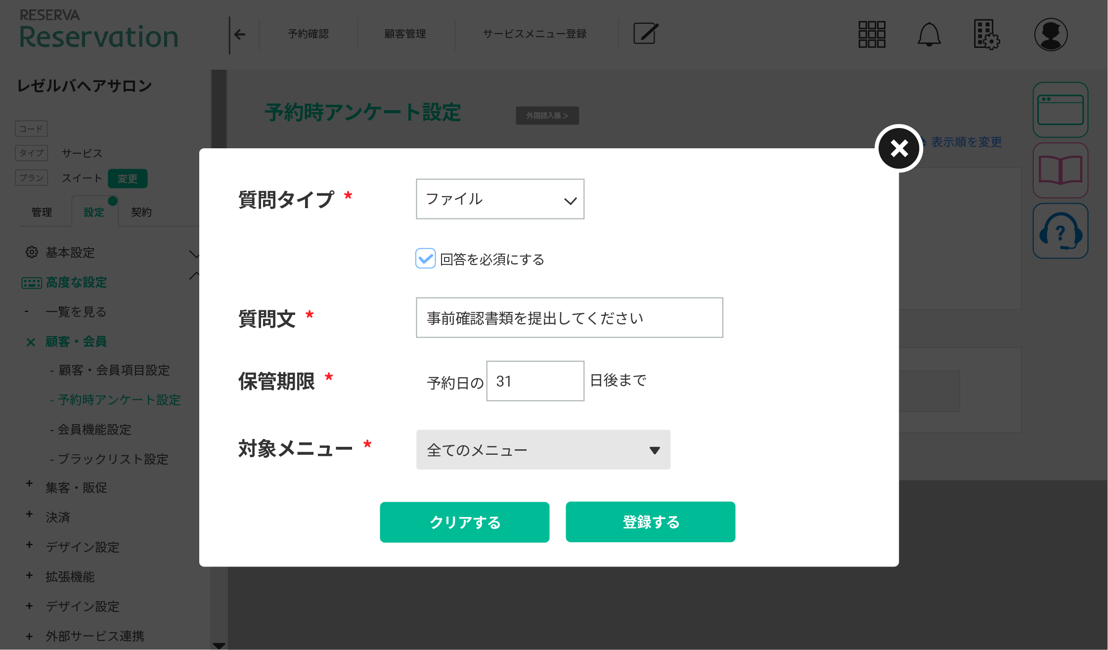 ファイル項目追加時に、質問タイプ、質問文、保管期間、対象メニューをカスタマイズすることができます。書類の提出自体を任意にするか必須にするかも設定可能。事業内容や運営形態にあわせて設定できるので、顧客側は何のファイルをアップロードするべきかがわかりやすくなります。