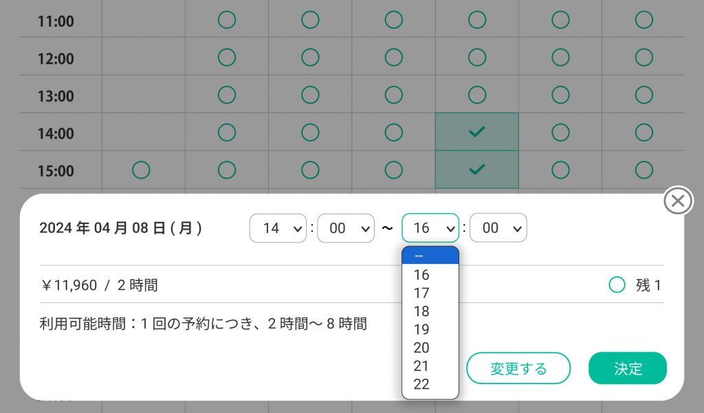 利用時間設定は、予約者が自由に利用時間を選ぶメニューにおいて、店舗側があらかじめ最低限の予約時間や上限時間、固定時間を設定することができる機能です。「最低でも〇時間以上の予約が必須」などの設定が可能で、例えば最低2時間で設定した場合、2時間未満の時間は自動的に表示されず、予約を受け付けない設定が可能となります。極端に短い予約を受け付けることがなくなり、売上の向上や施設運営の効率化に繋がります。