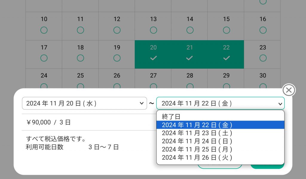 日単位の予約についても、利用可能日数の最低と最大を定められます。例えば、利用可能日数を「3日~7日」に設定した場合、予約者は利用時間として3日間以上から選択できます。1日や2日だけの利用や8日を超える利用はできず、予約不可となります。