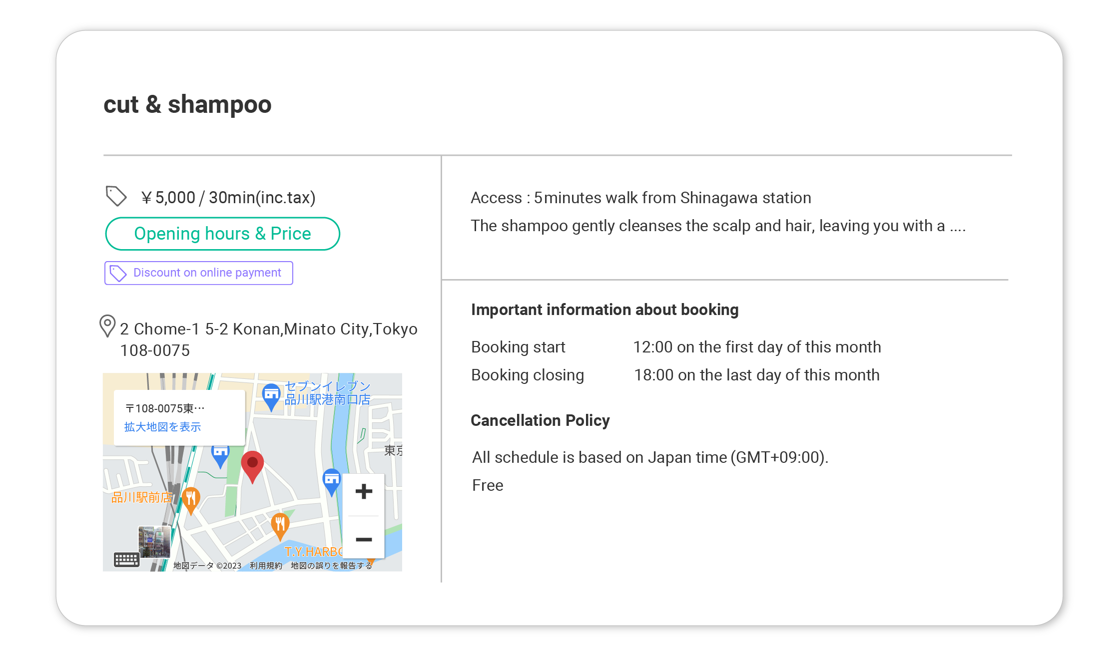 予約サイトの「営業時間」「お問い合わせ」などの固定文言や「予約する」などのボタンについて、自動で外国語表示に切り替えられます。対応言語は日本語、英語、中国語(簡体)、中国語(繁体)、韓国語、タイ語。日本語がわからない海外客向けの予約サイトを作成できるため、訪日インバウンド向けサービスの予約受付が可能になります。