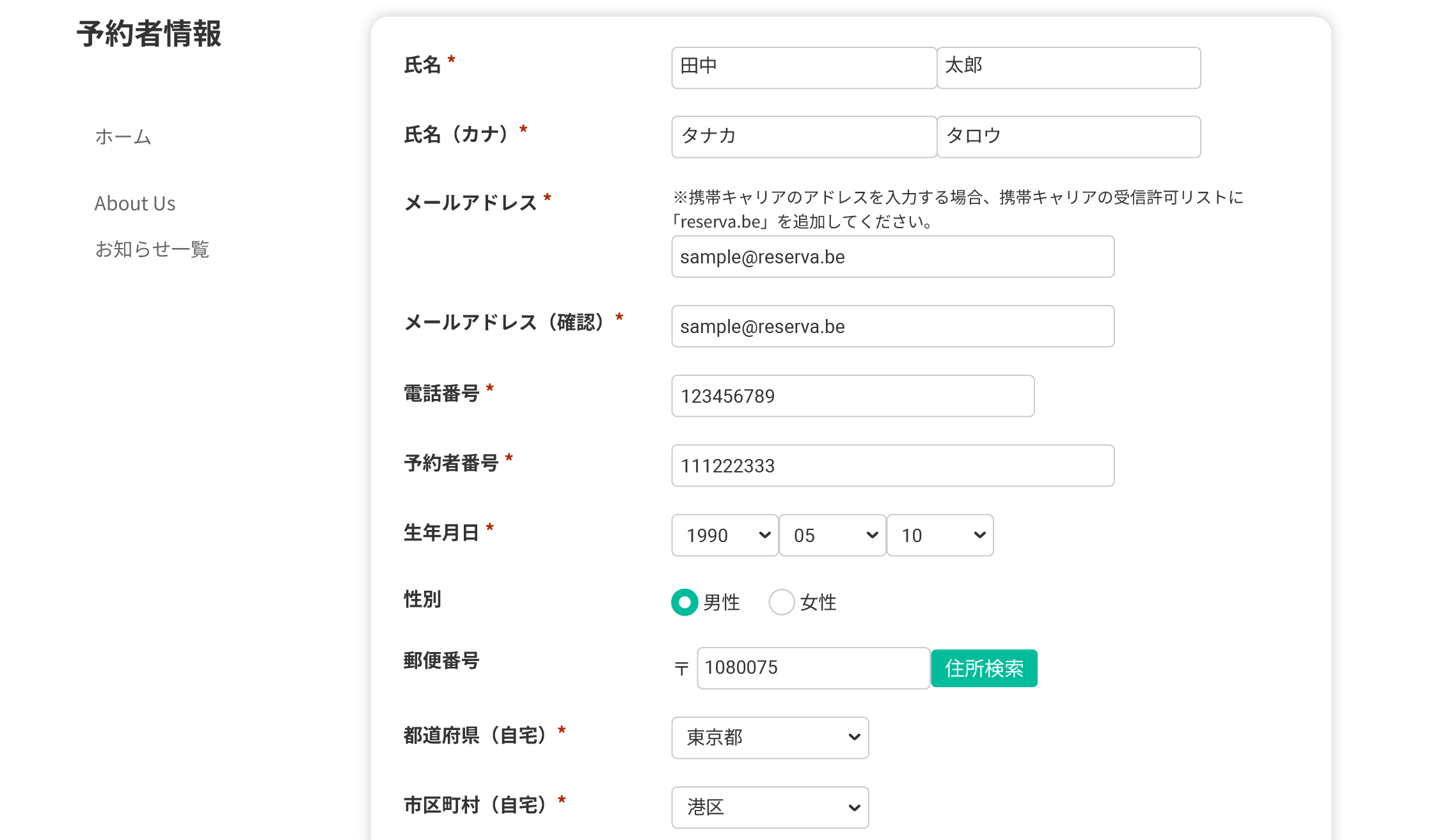 RESERVA予約システムでは、予約時に氏名(漢字)、氏名(カナ)、メールアドレス、電話番号が入力必須となっています。それに加え、定型項目として会社・組織情報、部門名、住所(会社)、住所(自宅)、郵便番号、生年月日、性別、会員番号を全ての料金プランで追加できます。店舗側は「いつ・だれから・どのメニューを」予約したのかリアルタイムに把握できます。