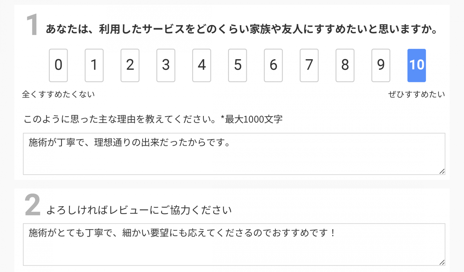 「Net Promoter Score(ネットプロモータースコア)」NPS®を取り入れ、顧客満足度調査に取り組むことで、店舗のサービス改善や既存顧客の顧客満足度の維持・向上に結びつくヒントが得られます。予約者は、店舗側が用意した質問に対し、顧客に 0〜10 点の 11 段階で評価をします。集計した顧客の評価は点数ごとに、批判者・中立者・推奨者の3段階に分類されます。
