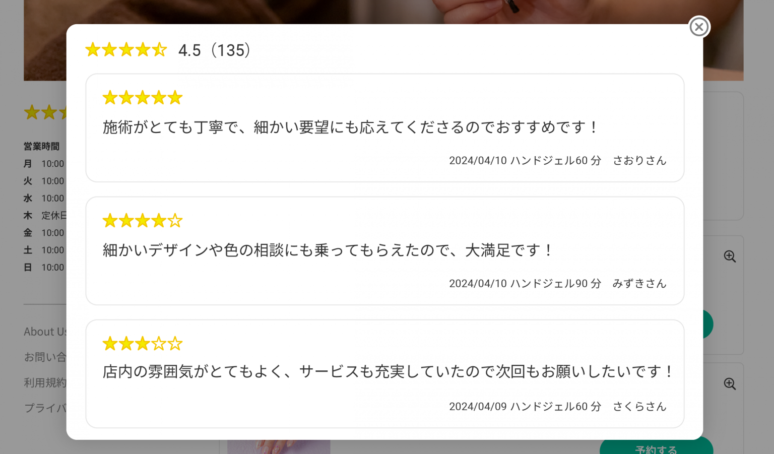 予約サイト上でレビューを収集することで、サービスの評価を画面上で可視化できます。