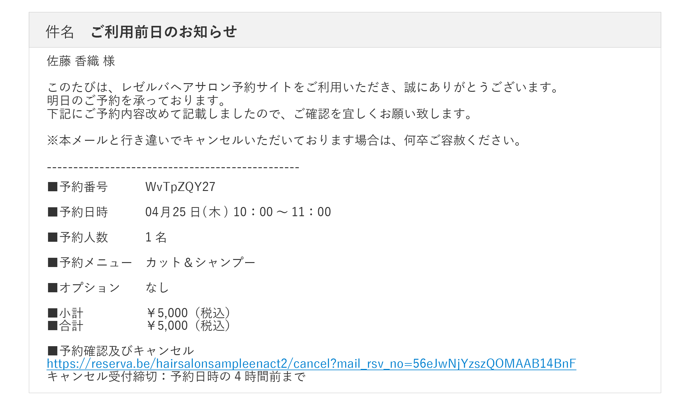 予約システムRESERVAでは、予約日前に自動でリマインドメールを送信できます。パーソナルカラー診断では、来店日時の失念や準備不足が当日の進行に影響するため、事前案内が重要です。リマインド機能を活用することで、予約忘れを防止し、キャンセル率の低下につながります。また、持ち物や注意事項を事前に伝えることで、診断の質も向上します。予約リマインドメール機能は、顧客対応の負担軽減にも効果的です。
