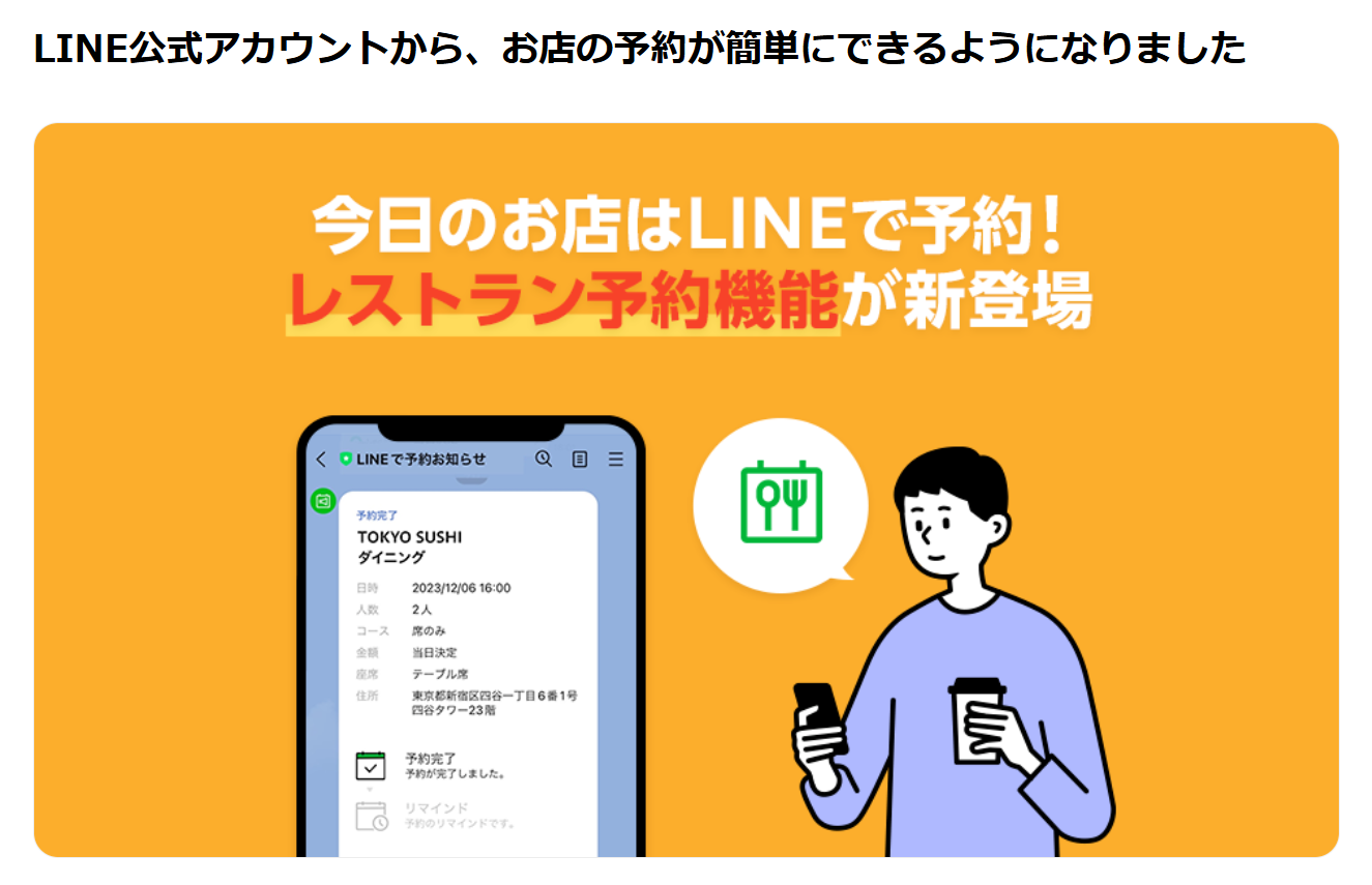 「LINEで予約」は、店舗のLINE公式アカウントからかんたんに来店予約ができる機能です。予約のみならず、友だちに店舗情報を手軽に共有できたり、予約日時の前にLINEで通知を受け取れたりするなど、LINEならではの便利な機能で予約作業を完結できます。